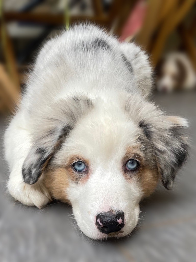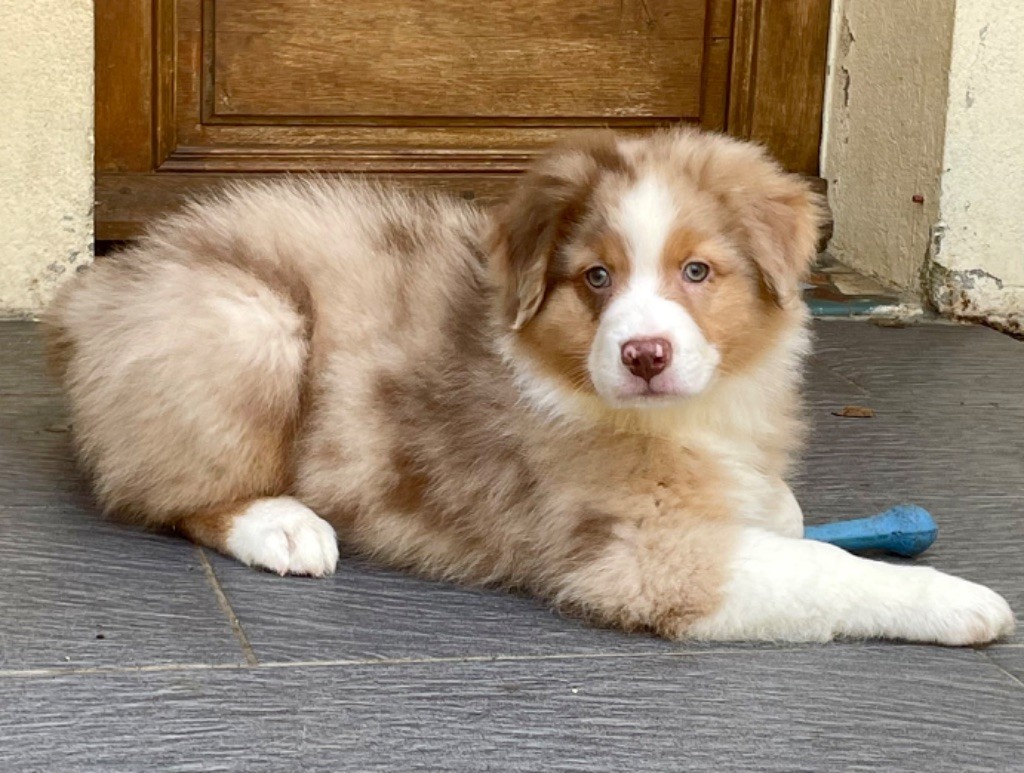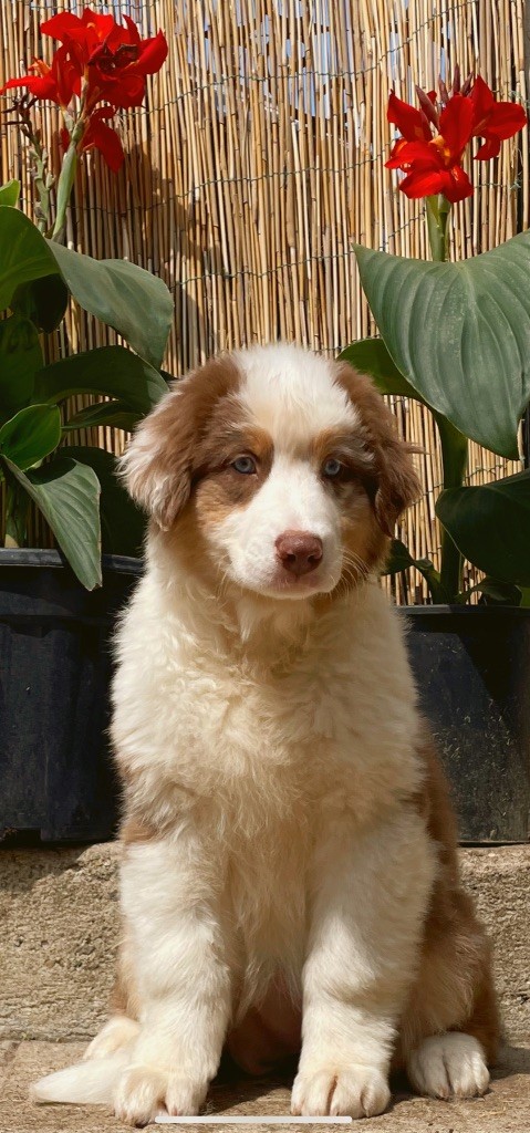 Marley mâle rouge merle aux yeux bleus caractère très posé , câlin et qui adore jouer autant avec ses congénères que les humains . 6,3kg damour !